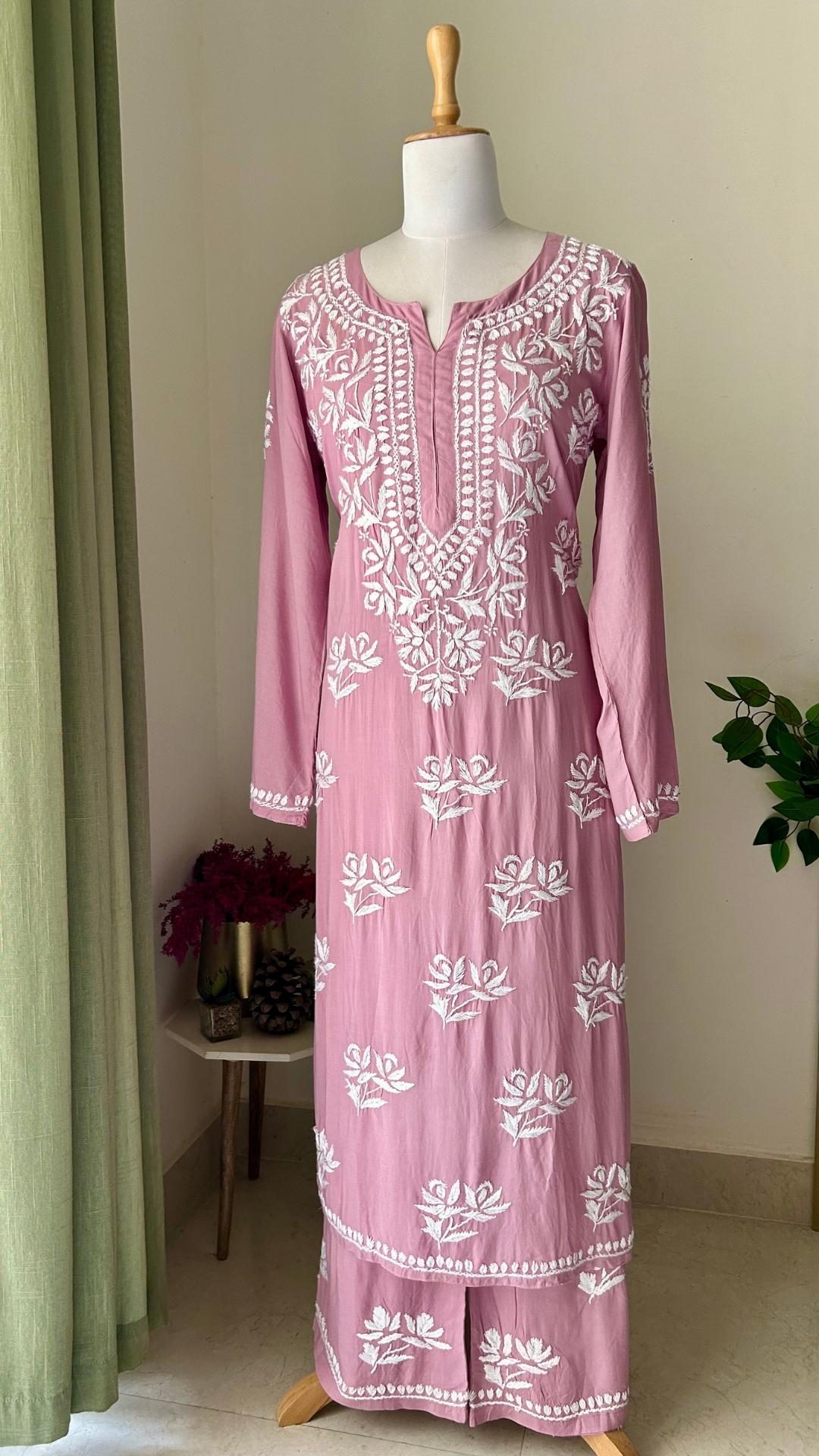 Premium quality modal kurta palazzo set with handmade chikankari. Butter soft texture and lightweight as feather