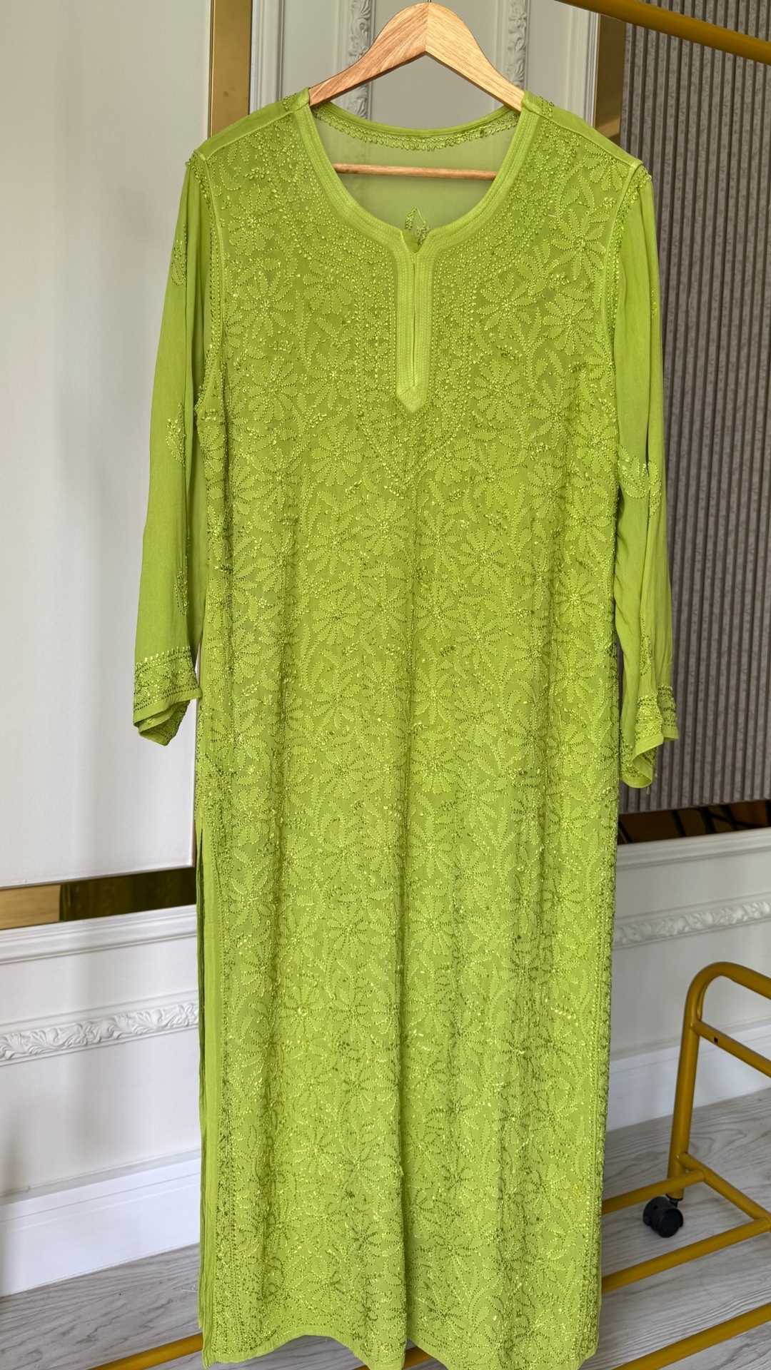 Viscose Georgette Silk Thread Chikankari Long Kurta - Lime Green