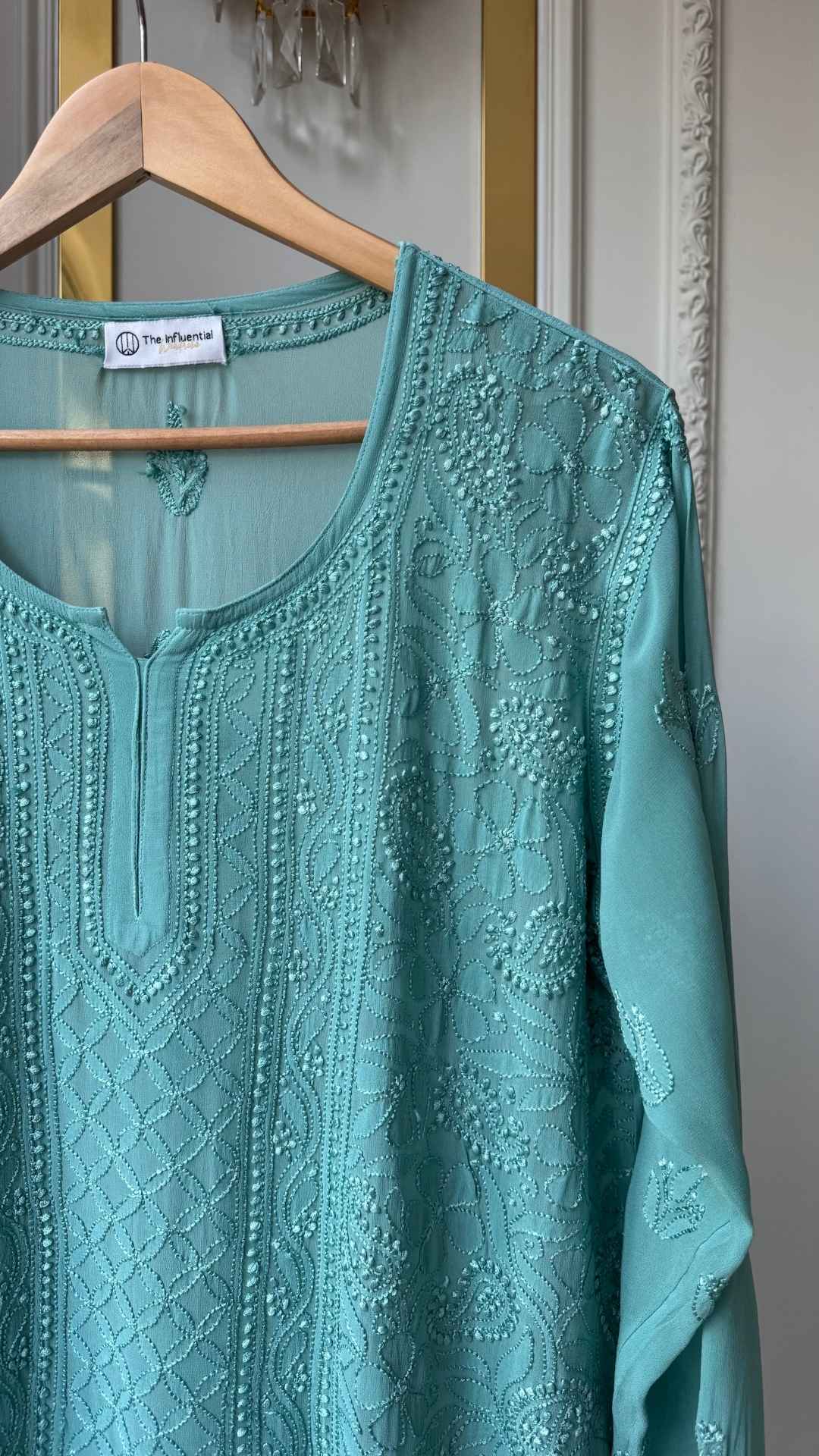 Viscose Georgette Silk Thread Chikankari Short Kurta - Mint Green